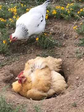 Dusting is a natural activity for chickens. In fact, it is necessary for their health! Our chickens seem to enjoy this activity greatly. They enjoy it so much that they have set aside a whole section of the coop just for this activity. They have dusting holes that can swallow up the smaller chickens, like Maeve, and we can barely see them! Sometimes when we go out there, a chicken will be almost upside down in the hole and for a second we think, “Oh no! She’s dead!” But – no far – that has never been the case. They really get down and dirt in their little dusting holes. The photo on the right shows one of the buffs in the dust hole and another waiting. What you can’t see are the other three or four holes to the right. They just pick a good place and turn it into the communal bath.