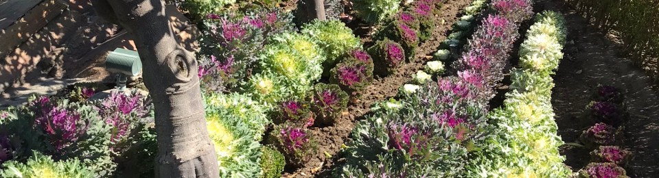 Rows of beautiful brassica under a Meyer Lemon Tree that is just starting to bloom.