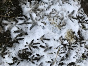 She has dropped her blanket of white over the hills and left her fleece behind in the draws where the sun never quite shows his face. Spent pomegranates hang from the trees like so many forgotten Christmas ornaments. The little dinos leave their tracks behind in the snow where only perspective can show how large or small the threat may be. Winter has come.
