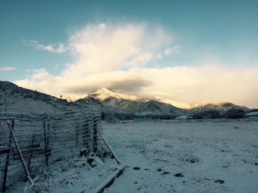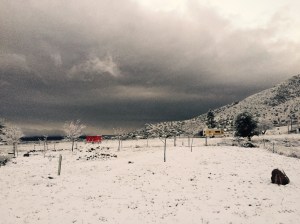 She blew in early this morning, rocking the parents’ 5th wheel and howling through the invisible cracks around the house windows; announcing the snow with a whistle across the stove vent as deep as the blow of a moonshine jug in a bluegrass band. But it wasn’t until we awoke and the sun began to burn the clouds away that we could see the full extent of her arrival.