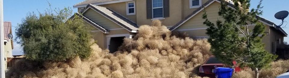 Sometimes we have issues with tumbleweeds. Not necessarily as bad as this house in the high desert of California, but they are a nuisance none the less. From a distance, they remind me of Tribbles and they seem to multiply with the same ferocity. We get them tangled in the electric fence all the time – they can do