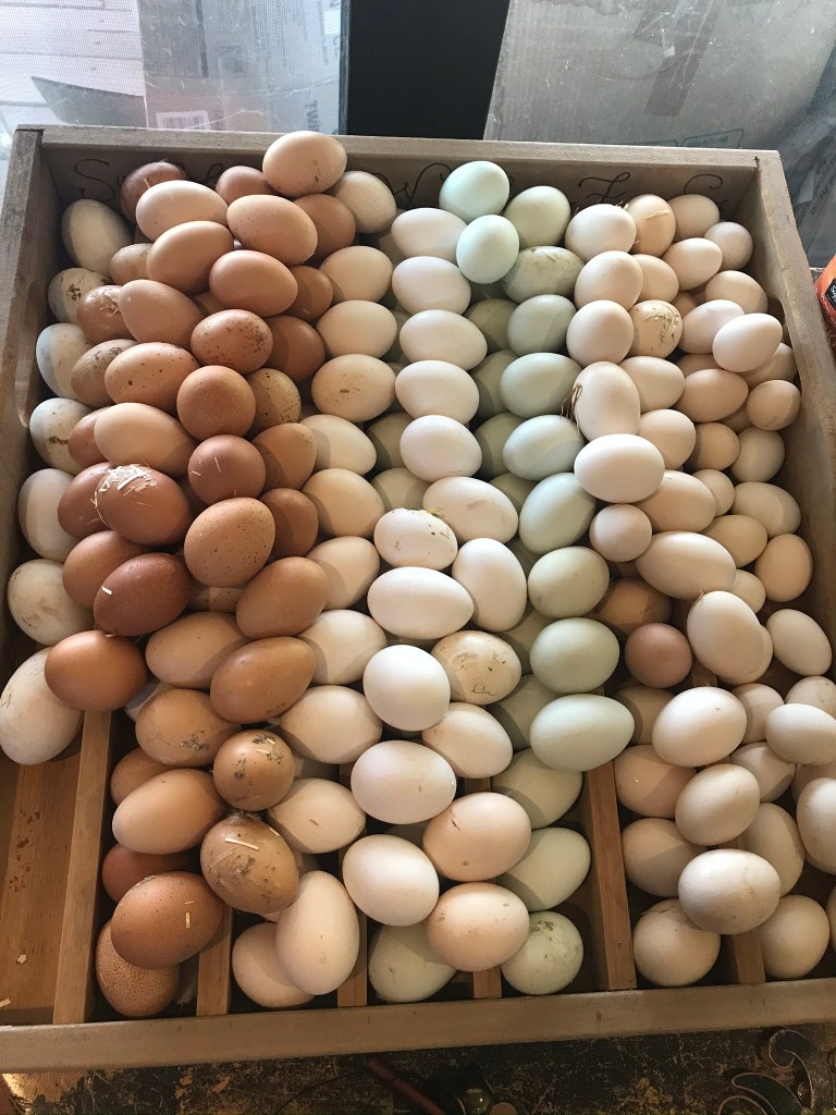 Before I left, I tried- and succeeded – in selling all the eggs. I asked several clients to wait until this week for their normal order and then sold all the rest. This allowed Sue to collect eggs all the while I was away and have enough room to store them without breakage. So, this is what I saw when I came home yesterday; beautiful eggs sorted by their lovely colors.