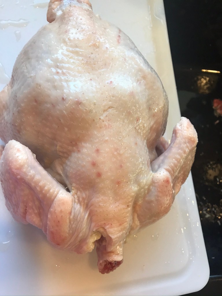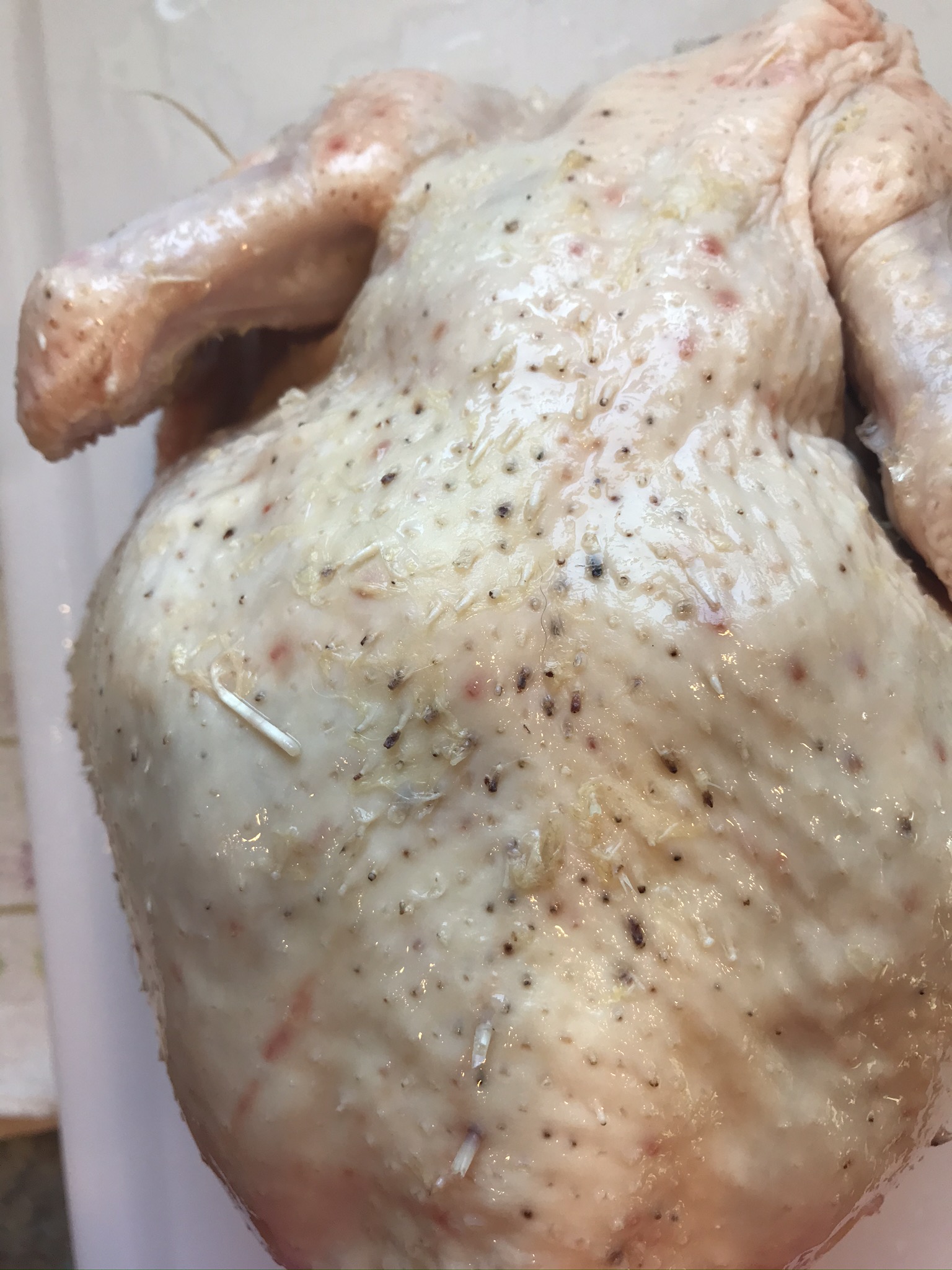 When they were finished for the day, all that remained to do was complete the final chicken cleaning and vacuum pack them. So, I started working on them in the morning. The thing with the summer chickens is that they are so hot all of the time, their feathers don’t always grow out. That means, when we process, the plucker cannot get at these undeveloped feathers and we need to work at them in post (so to speak). I know I’ve talked about this before, but it is difficult to explain, so I took a photo yesterday; before and after.