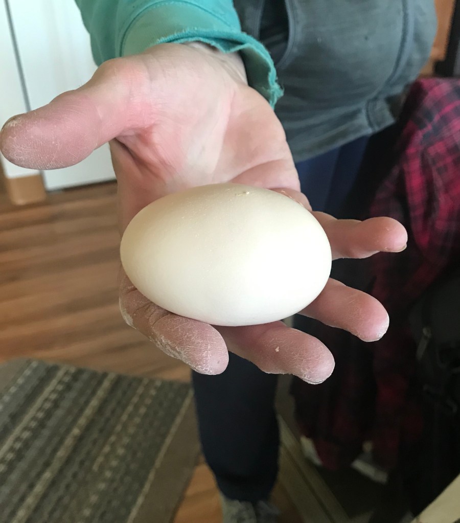 We’ve had some really interesting eggs too. This one in Sue’s hand is a chicken egg! It was bigger than some of our duck eggs. It was too big to fit in any egg carton, so I put it in the fridge for us to use one morning. I just asked that, if she used it, and it was a double yolker, that she take a photo.