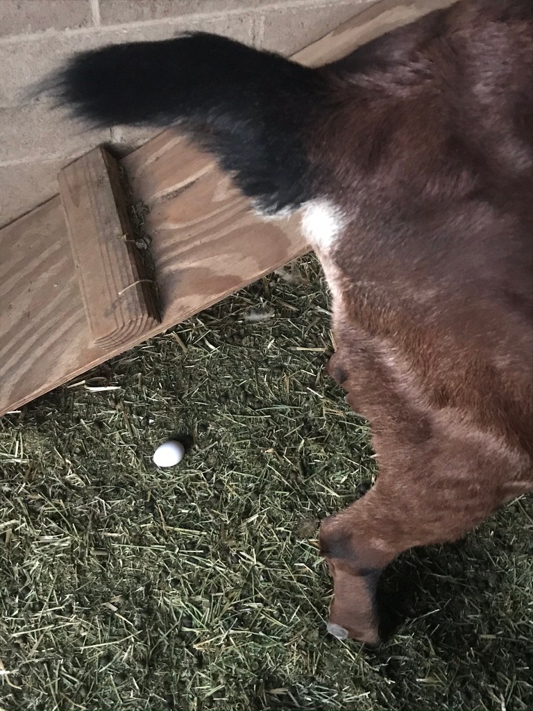 Let me share this one more bit of silliness with you. The other evening I took some sweet feed to the goats for their normal bedtime snack, placed their feed buckets on the floor of their house turned around and saw this. I laughed out loud because it looked like the goat had laid a little egg! it was funny!!! Guess you had to have been there.