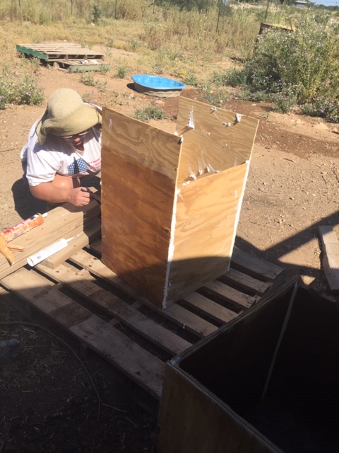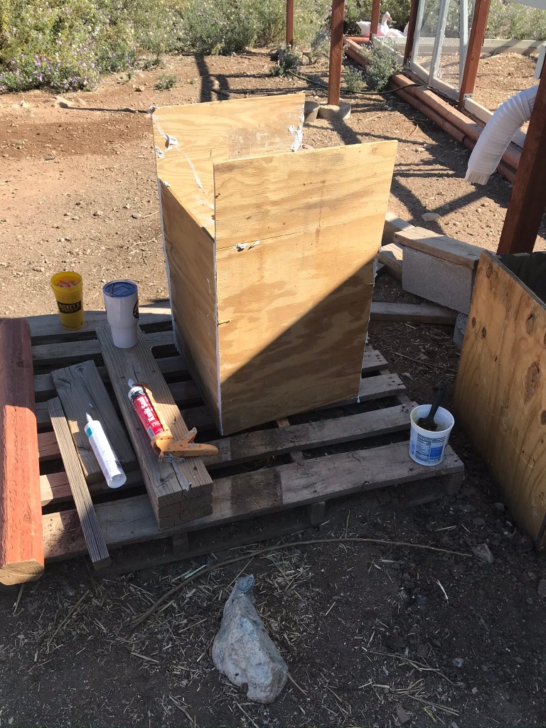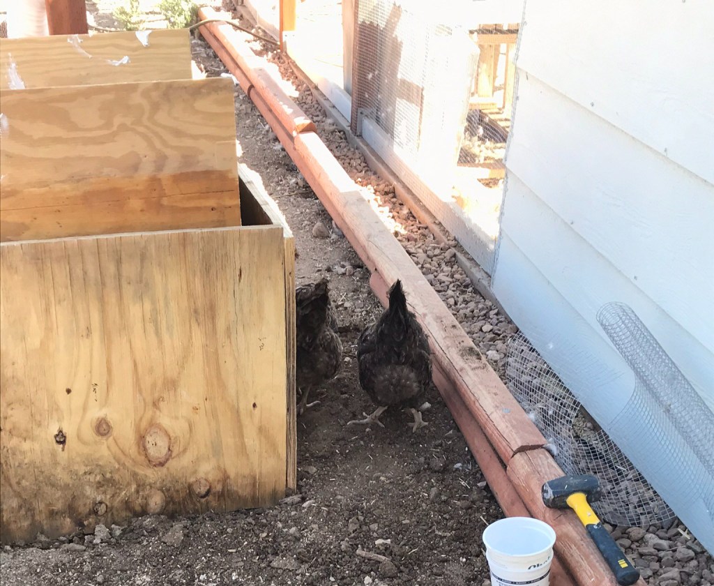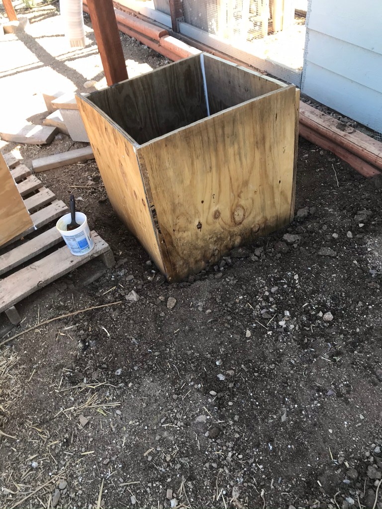 Not only can you see the nosy little ones there, come to interfere, but you can also see how the form looks ready for concrete. We used all the concrete we had and ended up buying more. We now estimate that it may take 8 bags for each container. We are going to let the container cure for at least a week before we take off the form. Them we’ll have the great revealing! Over all, we plan to make 6 of these – three on each side of the coop. That’ll provide great coverage and shade. It’s also the reason I say it will take a few months to finish. We’ll see how everything comes together.