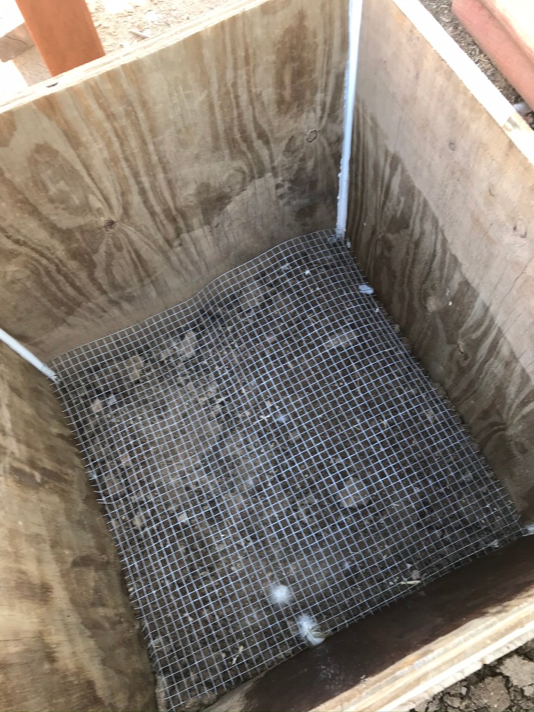 Because we have many voracious gophers, we added welded avian wire at the bottom, which will be embedded into the walls of the container. We no longer plant anything, anywhere, with out the protection of a wired shield of some sort.