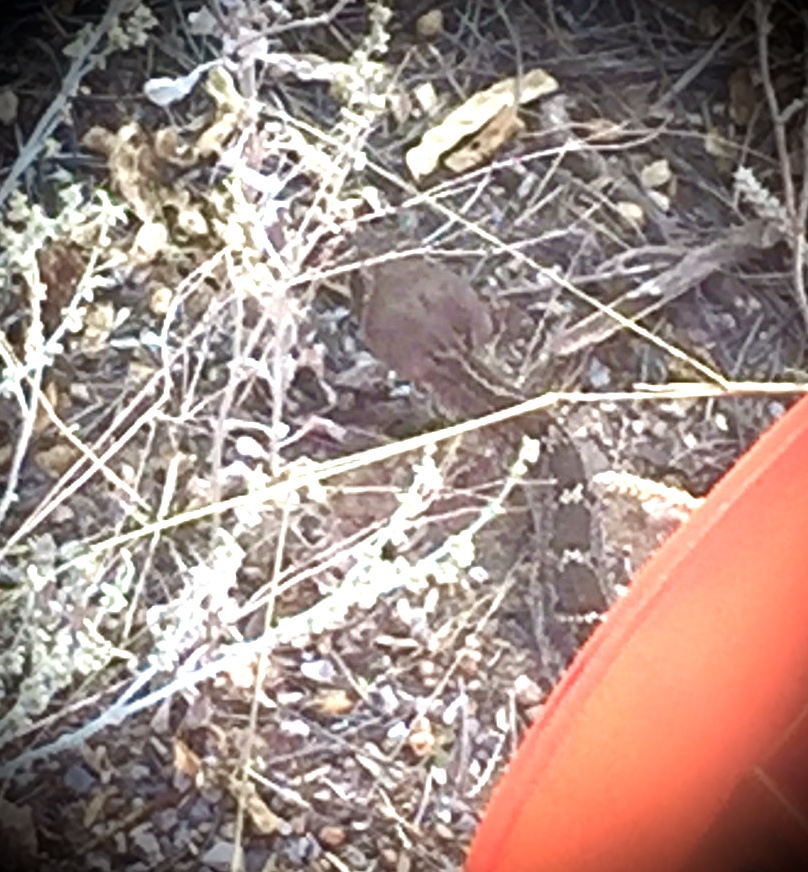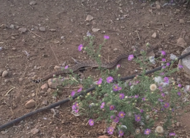 We’ve had our fair share of rattlers this summer – let me tell you! Just last week there was another one in the coop run. He was curled up right by one of the chicken feeders. It was a very cold morning and he wasn’t moving. Sue used the snake stick and picked him up with his whole body still coiled… he made no sound. A few days before that, there was one in the dove enclosure. We moved that one too. The most recent snake was one we called “crooked tail”. He has been spotted at the goats, at the RCW, all over the property. He’s the first photo below, the dove snake is the 2nd. Can you see them?