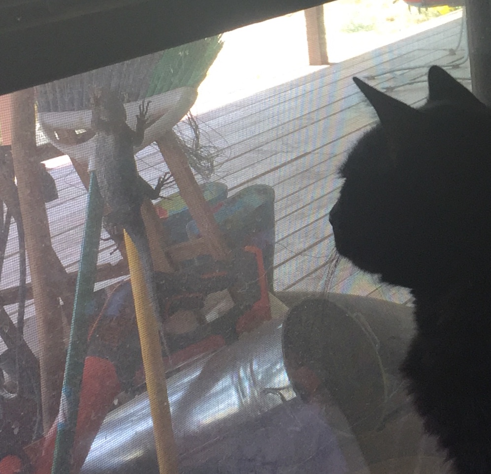 We see them, the dogs chase them, the cats chatter at them; it is a regular daily occurrence. Here is Morgrim intently watching a little Chuckwalla on the window screen. They hang out on the porch a lot. Which means that we are relatively free of spiders and bugs. It also means we find our Road Runners on the porch, sometimes; they enjoy hunting Chuckwallas.