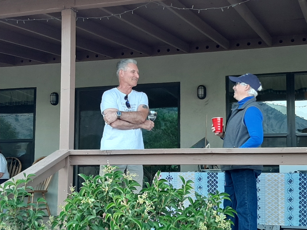 We congregated on the veranda for canapés and cocktails. Here is the retired Marine with the retired Sailor enjoying some conversation. (Photo Credit: Kay)