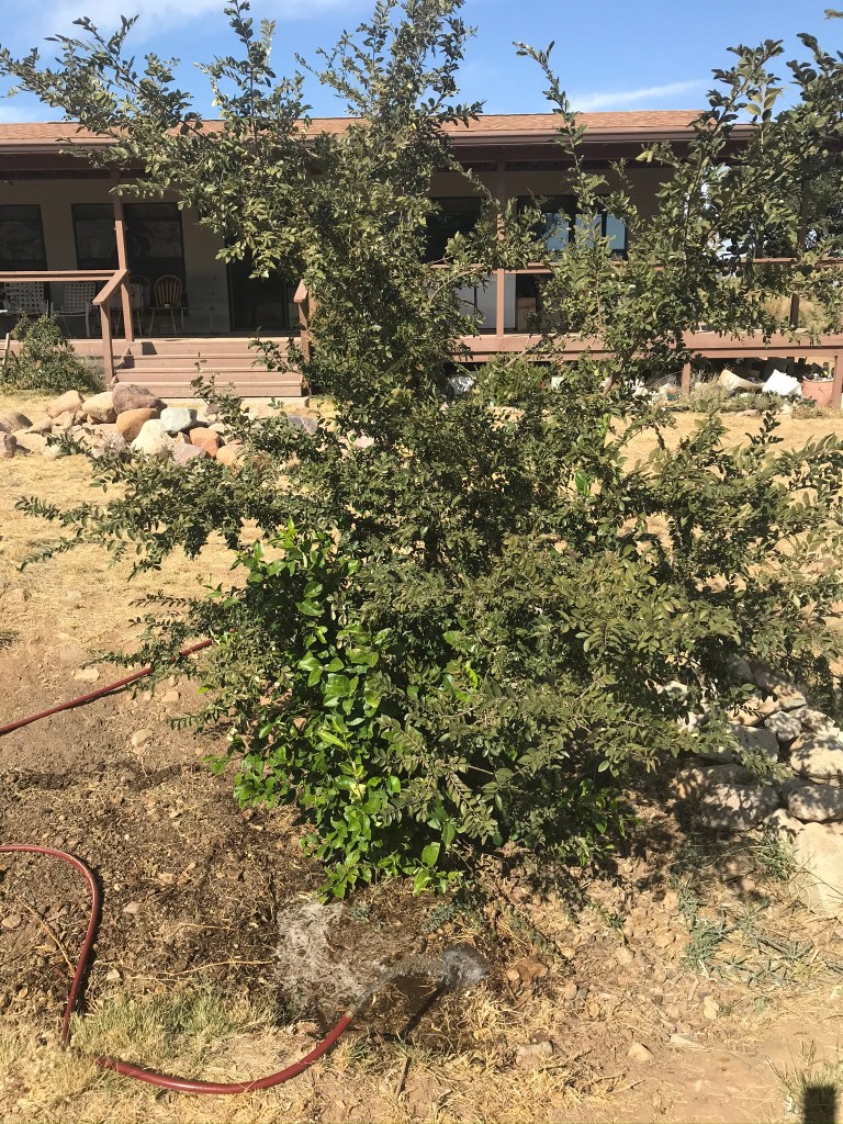 You may scoff, but when we had our couple of nights of hard freeze, I did not cover the lime tree, and this is the extent of the frost damage. The elm tree will eventually loose its leaves and then I will end up wrapping the lime tree for the winter. But for the quick frost, the elm did its job quite well. I’m hoping that get along long enough that we’ll eventually get actual limes! Time only will tell.