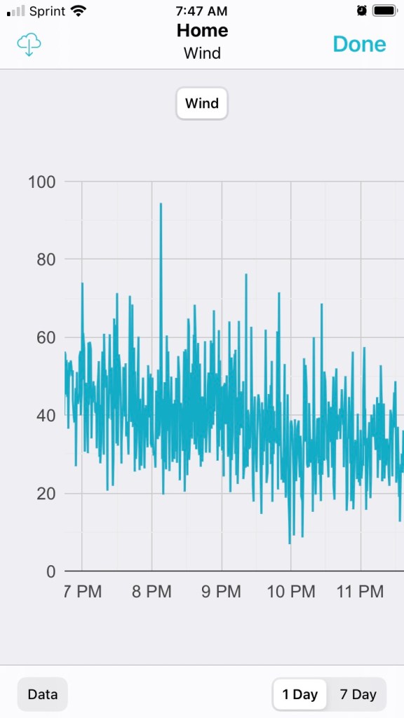 This is a photo off of my phone that is connected to our weather station in the back yard. The wind gauge is attached to the southernmost gabion garden. You can see that we had a micro-burst of around 98 mph. The winds gusted between 25 and 80 mph all tha rest of the night and finally stayed down in the 20-30 mph range starting at 3pm.