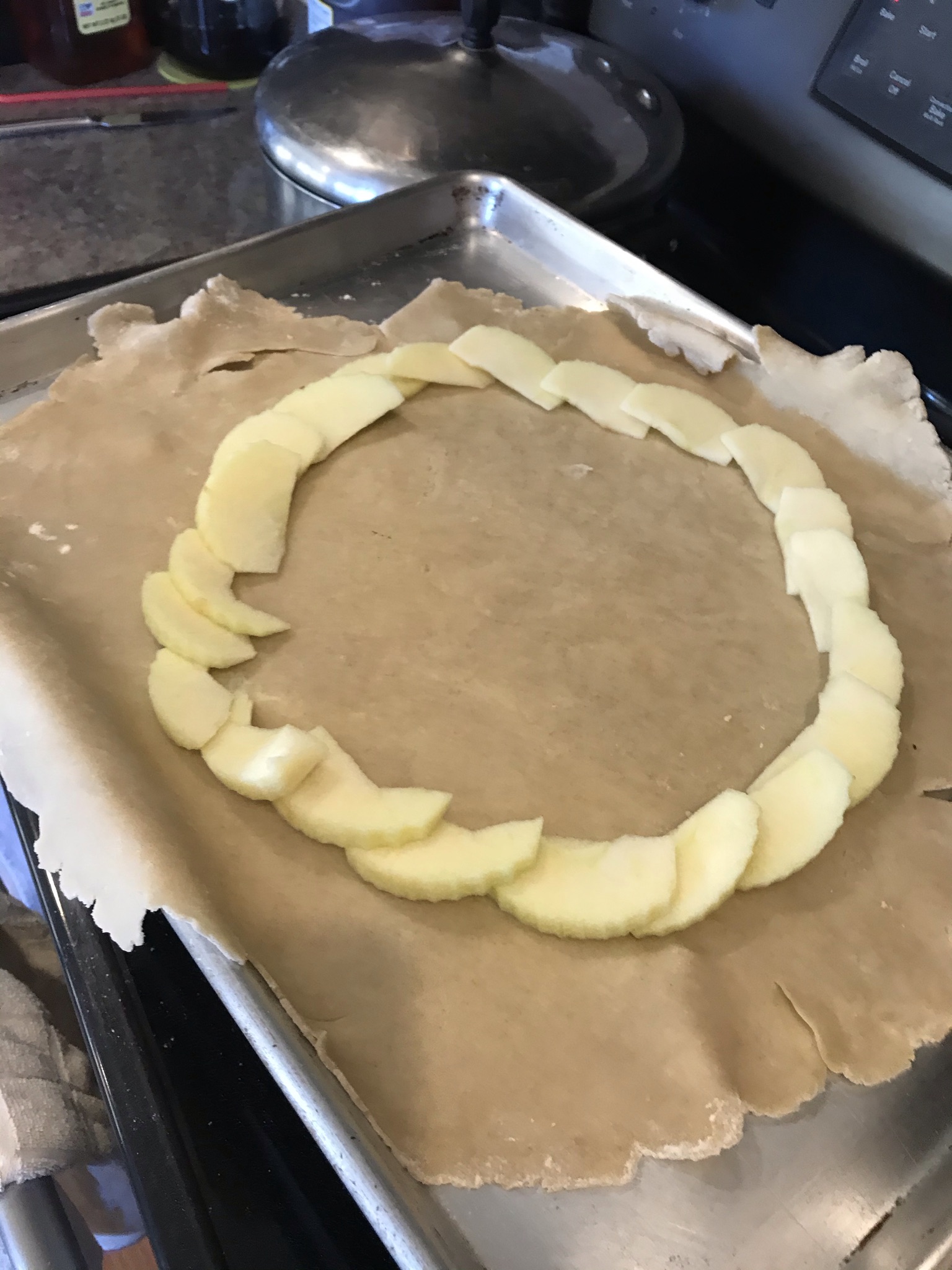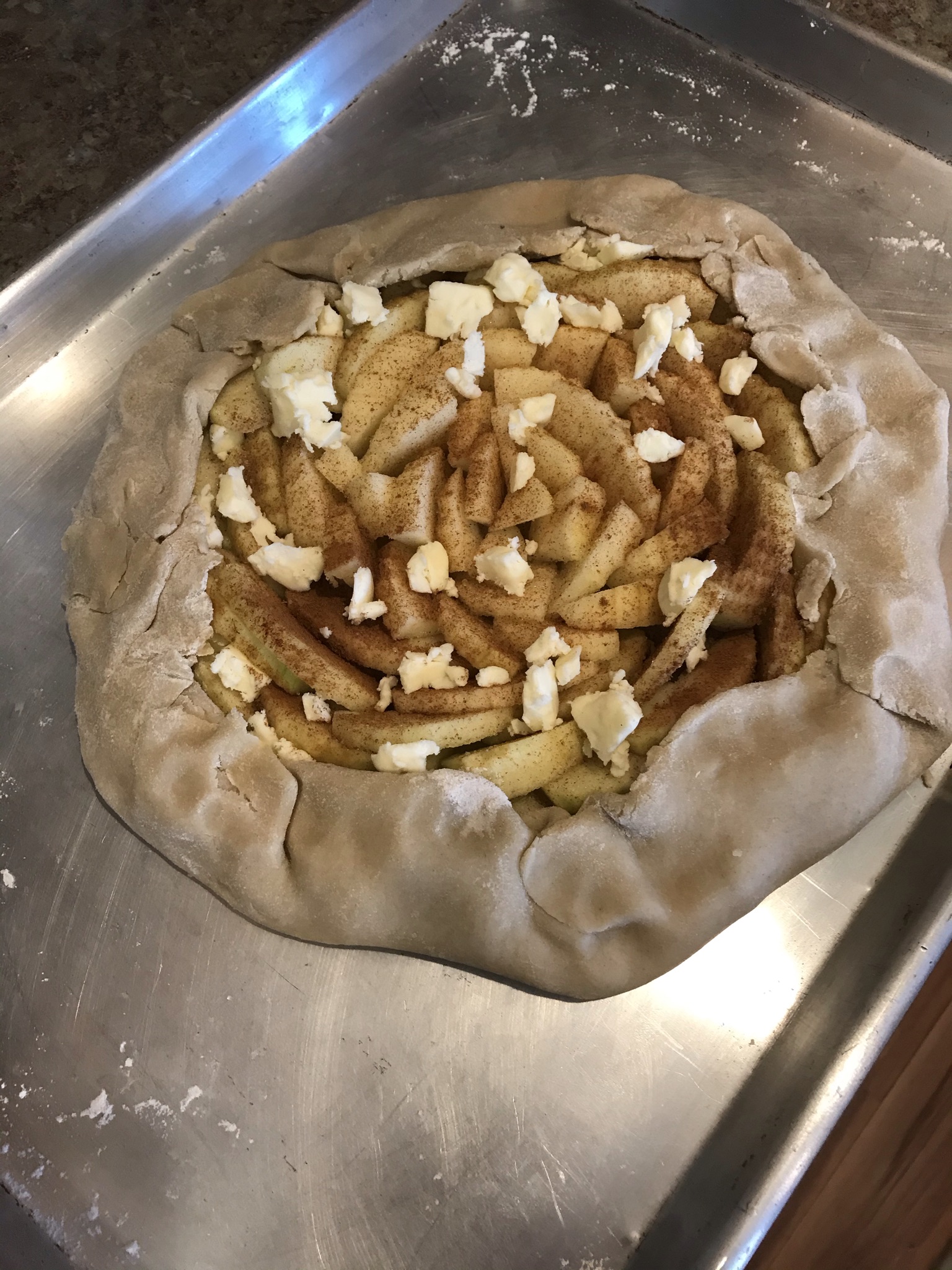 What do you do when you’re feeling a bit blah? It seems I do one of three things. I clean the house. I work in the yard. I cook. Saturday I did a bit of pruning – see the most previous post. Sunday I spent some time in kitchen. Our neighbors, Sherry and Arnie, gave us a huge sack of their apples. So, I made an apple galette our of a few, and then turned the remainder into apple butter. I didn’t can it, so we’re giving it away to neighbors. It’ll have to be eaten in the next couple of weeks. Not that this is the most interesting of subjects, but below is the collage of the galette and the apple butter.