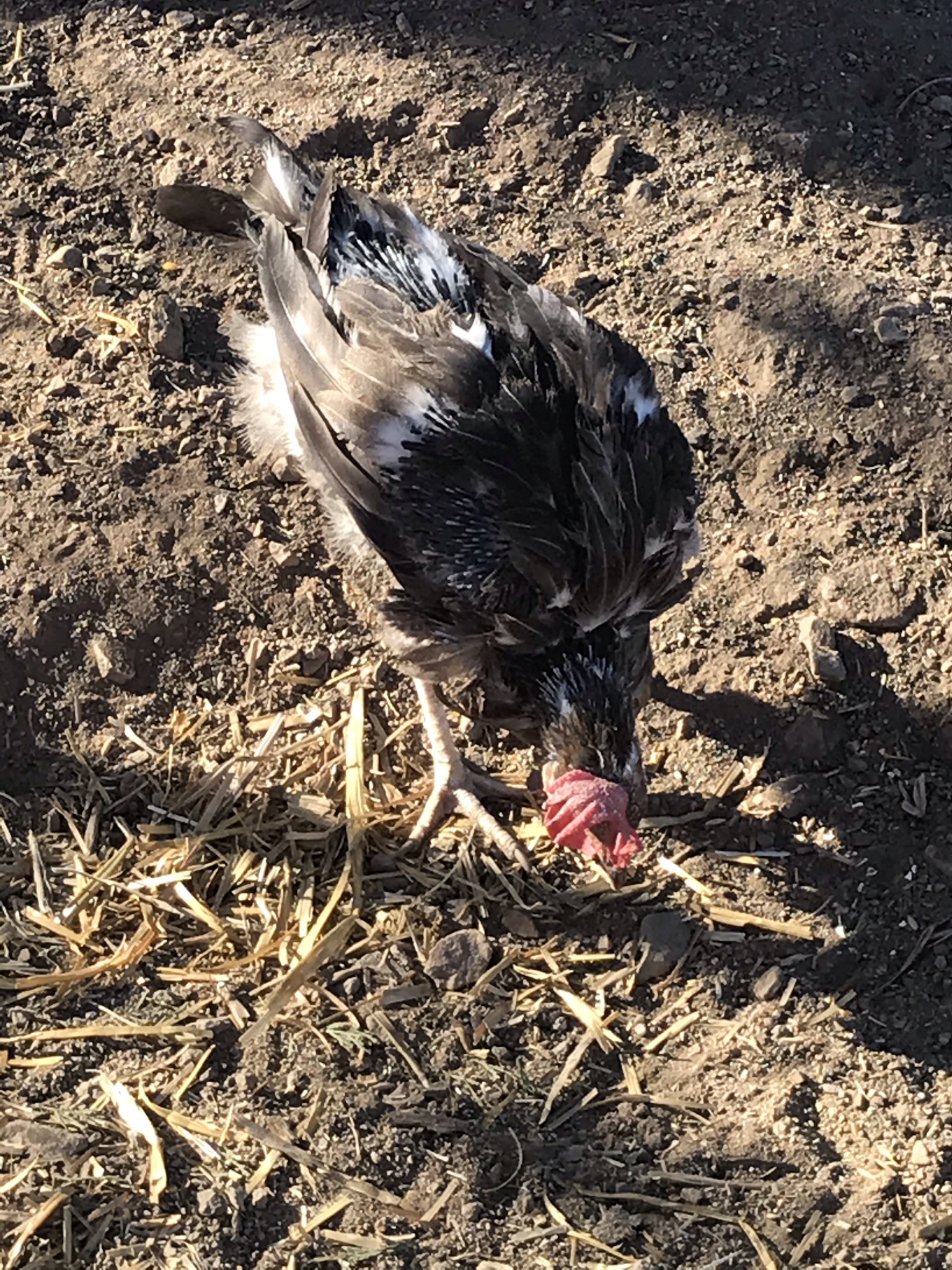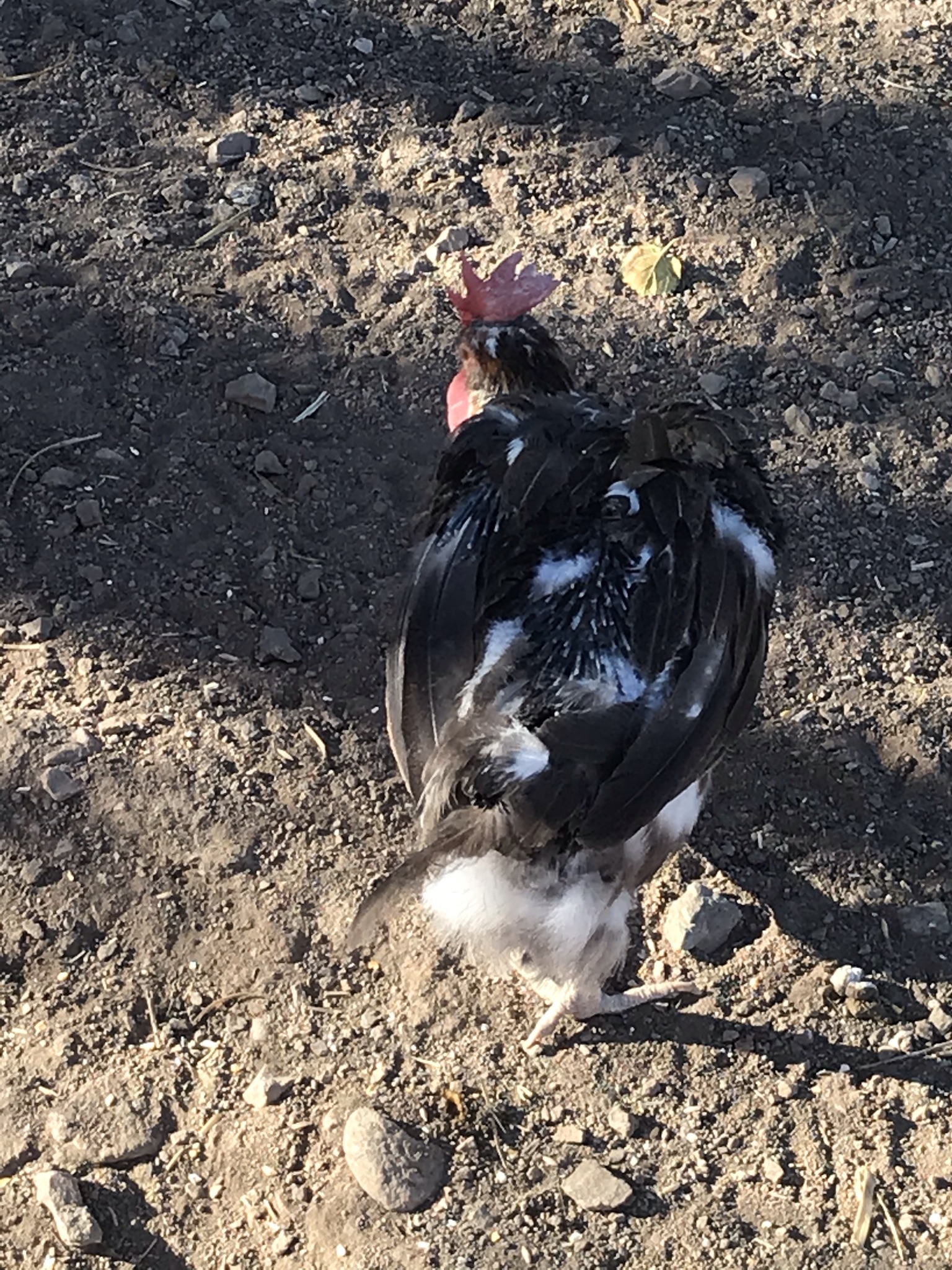 This chicken is on the tail end of her molting. Just in time to be finishing, as we are warm this week and, by the time the cooler weather hits, she’ll be done and all feathered out. In the mean time, she looks like a zombie chicken.