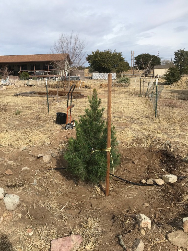 We began the planting day by putting our Christmas Tree in its permanent position in the tree line. It looks good in its new home. We put it in the line up for the wind break… then we got wind. Coincidence? Perhaps not. Poor little thing didn’t know what it was getting into. We’re hoping it fares better than the last one.