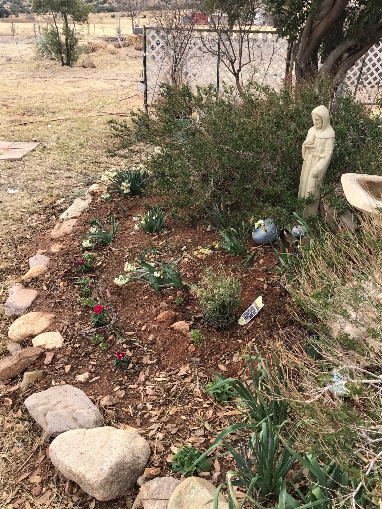 When we were done with that, I thought it’d just take a few minutes to stick a few flowers in the ground, since we were making it a planting day. The wind had died down a bit and clouds had come over – I thought if I had to worry about anything, it’d be rain. I am hoping to get some flowers in and blooming so when the bees really begin searching in earnest, they’ll have something to work with other than chicken feed.. So, since the narcissus are already blooming in the St. Francis garden, I added sweet alyssum, petunias, and dianthus. I planted them in a wire trough so that, perhaps, the gophers will leave them alone for a bit. I had some left over, along with a pony pack of violas, so I also refreshed the gabion gardens and the wheel barrow.
