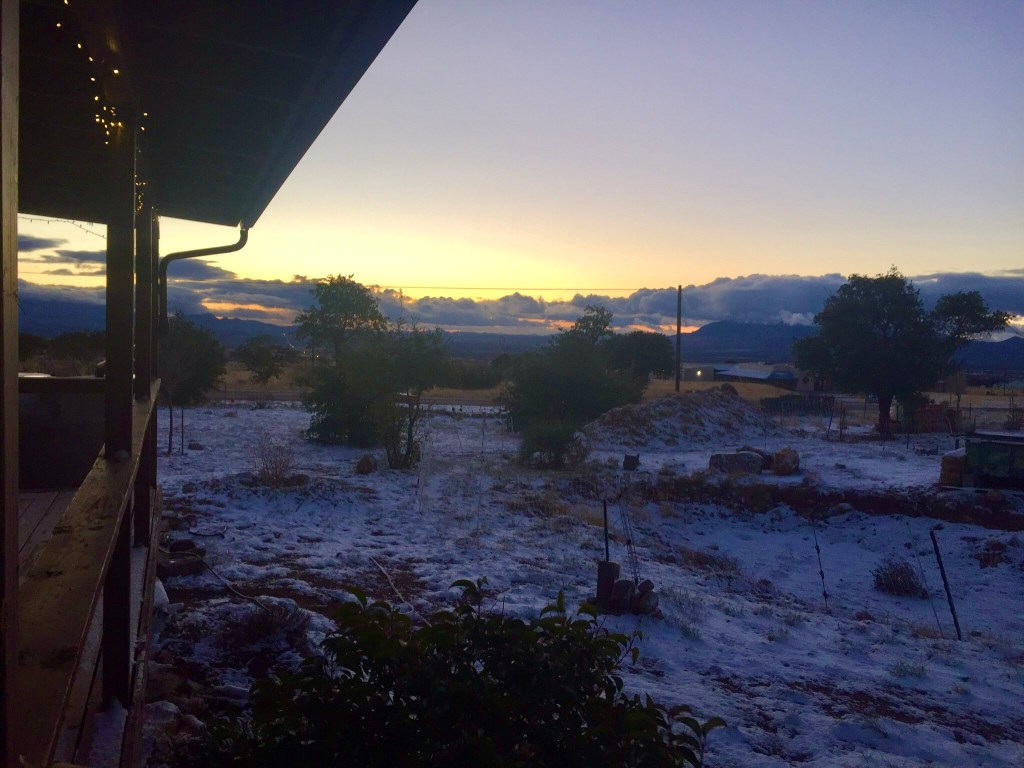 …of execution. That’s what has happened today. To the left you see the sun dawning on a good day for the roosters that were scheduled for the pot today. That white stuff on the ground is our third snow of the year. I guess it made it over the mountains from California. The wind sure blew enough to get it here!