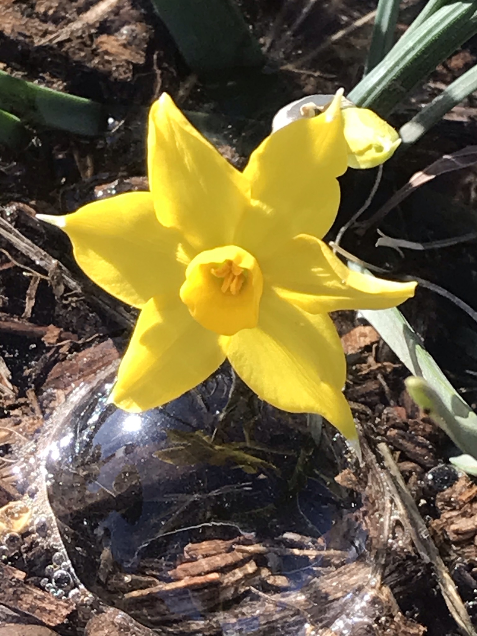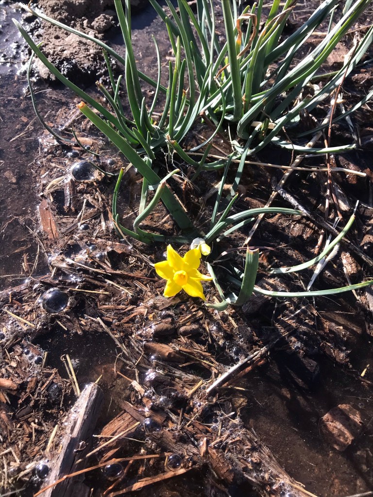 While watering today I happened upon this cute little mini jonquil who decided to show her bright face this morning. I guess mom planted it along with whatever other little bulbs she stuck in the ground at Thanksgiving. Hope the squirrels and gophers leave them alone this summer! I’d love to have those just naturalize all over the garden! The bloom is just a little bit bigger than my thumbnail. Difficult to tell without something for scale; I don’t usually think about that when I’m out doing “wild” photography.