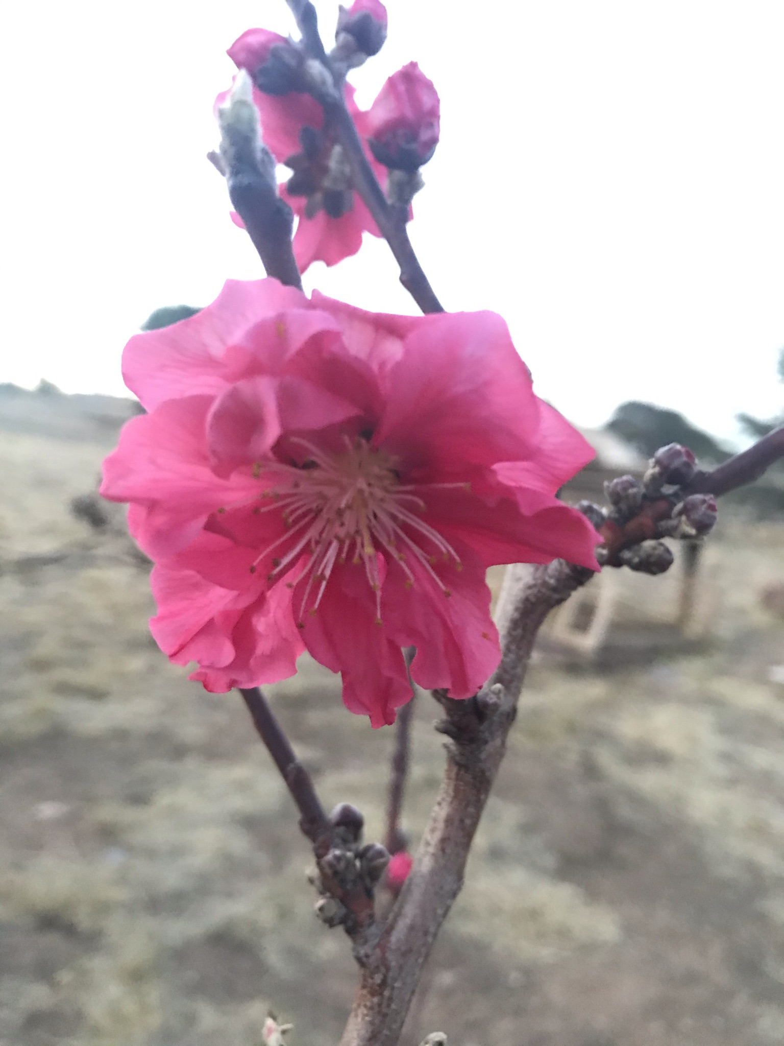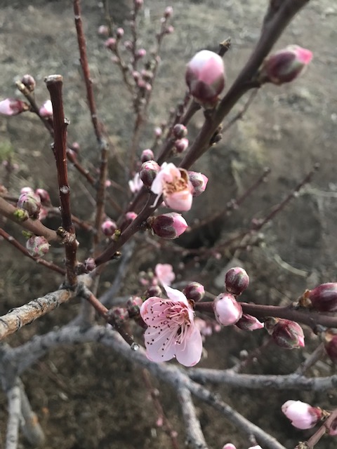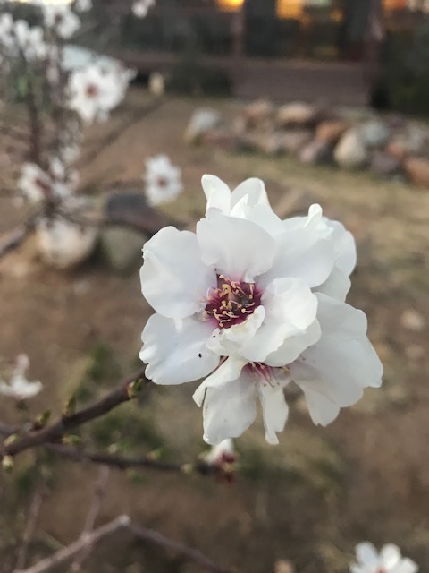 While spending some time with my folks last week, Sue texted me this photo. Knew which tree it was immediately. First tree to bloom? Always the almond! Sometime is blooms early to its detriment. Sue was afraid that it would loose its blossoms to the cold, as it was still freezing in the mornings last week. But it held on to them and the squirrels are already planning their late summer harvest. This year, I am going to put tulle around the tree so they cannot get to the almonds! Need to wait until after they have set though, so the busy bees can do their job. We’ll have to do the same thing to the nectarine, peach, and plumb trees that have begun to bloom out as well. Trying to save things from the critters is keeping us very busy. AND now we have escapee chickens, everyday, that are having a bit too much fun in the flowers!