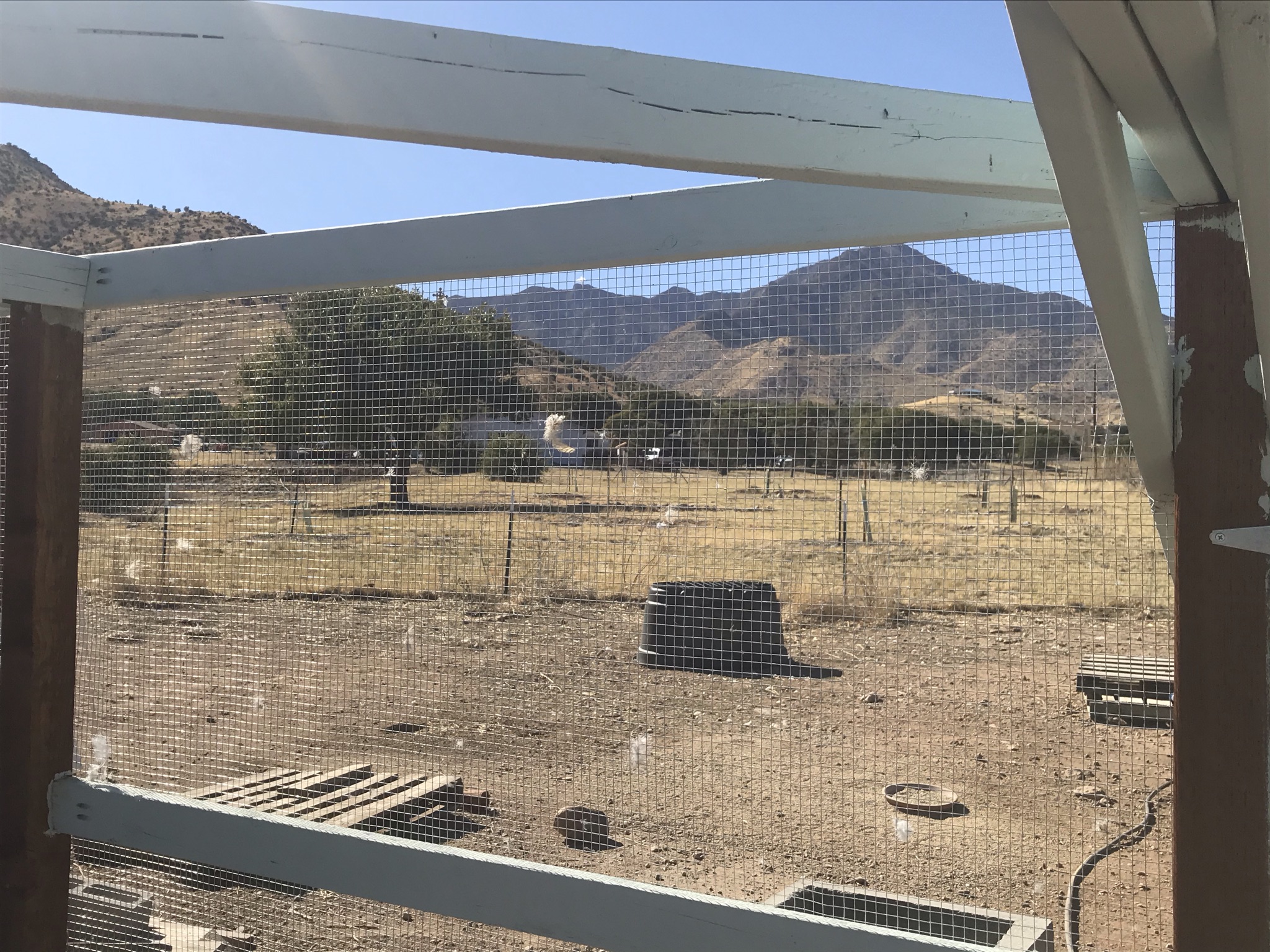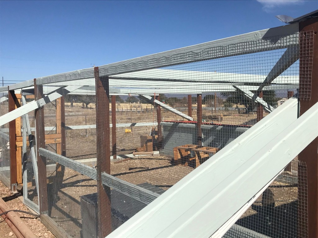 This is the project she started tackling by herself. Putting up the welded avian wire around the Main Chicken Coop’s run. It is so difficult to work with this stuff, straight from the roll – it goes everywhere! But Sue decided to work on this by herself. She said that she learned how to use the clamps well. 🙂 It’s coming together quite well. We’re going to put regular chicken wire on the “roof”. That’ll be a project that moves up on the list, because Sue found a hawk in the run the other morning! Here’s a couple more photos of the great job that she did.