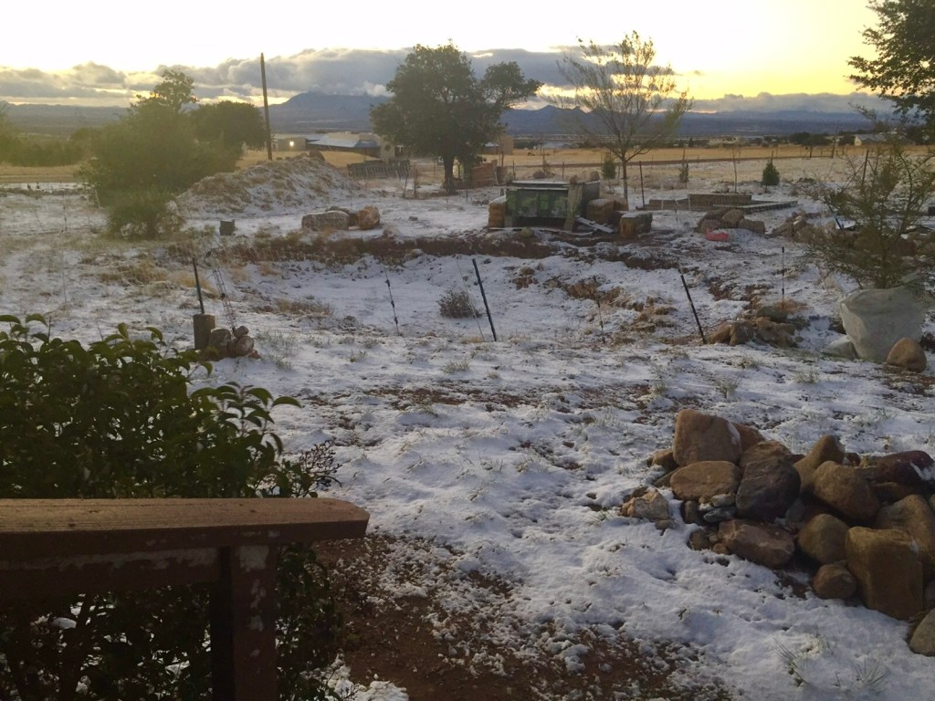 …of execution. That’s what has happened today. To the left you see the sun dawning on a good day for the roosters that were scheduled for the pot today. That white stuff on the ground is our third snow of the year. I guess it made it over the mountains from California. The wind sure blew enough to get it here!