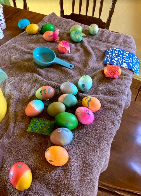 I was hoping to have many colored eggs to share – but so far, the only photo I’ve received is from Ali. She and her family have been continual customers since the beginning of the pandemic. The last couple of weeks I’ve been trying to make sure they’d have enough eggs to color. Her daughter likes the little ones. Yesterday, Ali texted me this photo of all their artistic handy work! I also know that Sheila, another long time customer, colored banty eggs with her grandkids yesterday – but she forgot to take any photos!