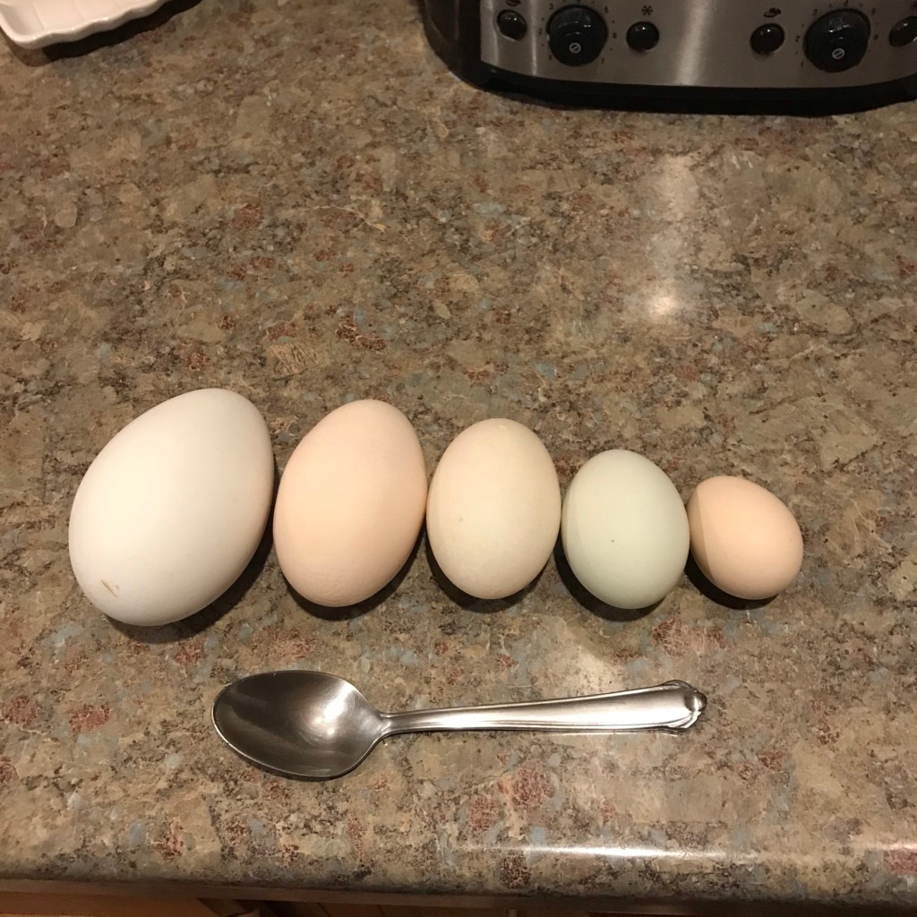 Since it is Easter, and there are always eggs of some sort around the holiday, I thought I’d just share a couple egg photos. I took this photo a few weeks ago when we ended up getting a humungous chicken egg. It was way bigger than our duck eggs and just a bit smaller than our goose eggs. I just had to take a photo of it because I was so astonished at the size. (Sue ate it for breakfast one morning and it was a double yolker!) So here is the evidence, with a regular Teas Spoon for scale. Left to right we have: