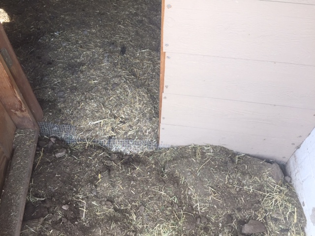 This photo may, at first, be confusing. What you are actually supposed to notice is the welded avian wire that is sticking up from out of the ground in the doorway. Here it will be acting as a deterrent to those trying to dig into the ground outside the door. Did I talk about this already? We dug a trench outside of the coop at the Goat Boy’s house, lined it with extra pieces of wire, put heavy stones on top and then filled it back in. Seems I mentioned it recently. Well, we used bits and pieces of wire that might have otherwise found their way into the garbage. We know it’s not “skunk proof”, but we hope it will act as a deterrent.