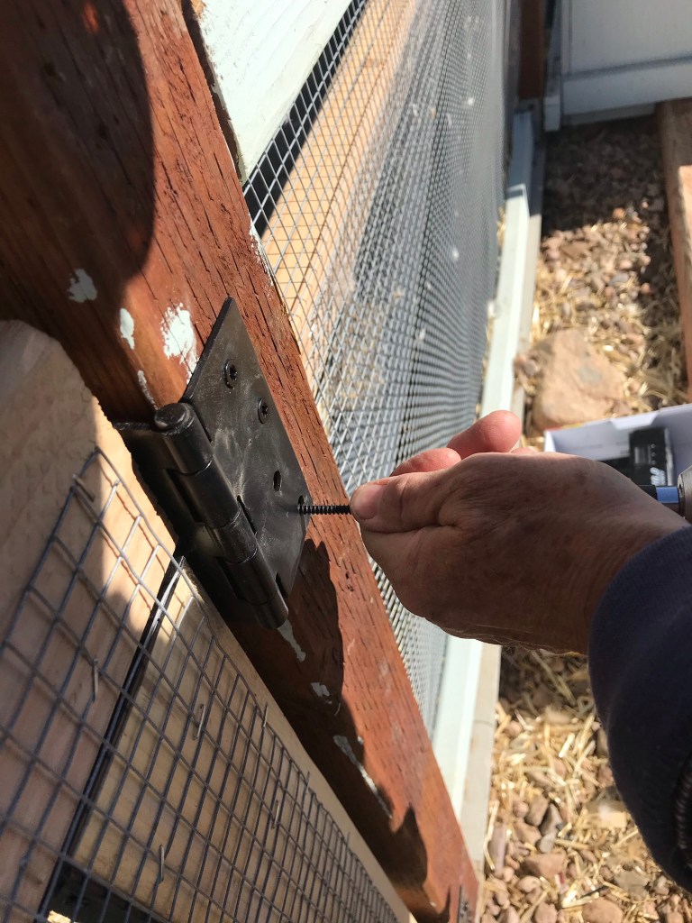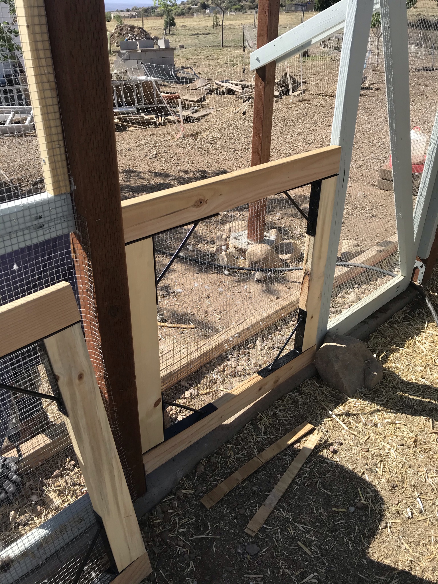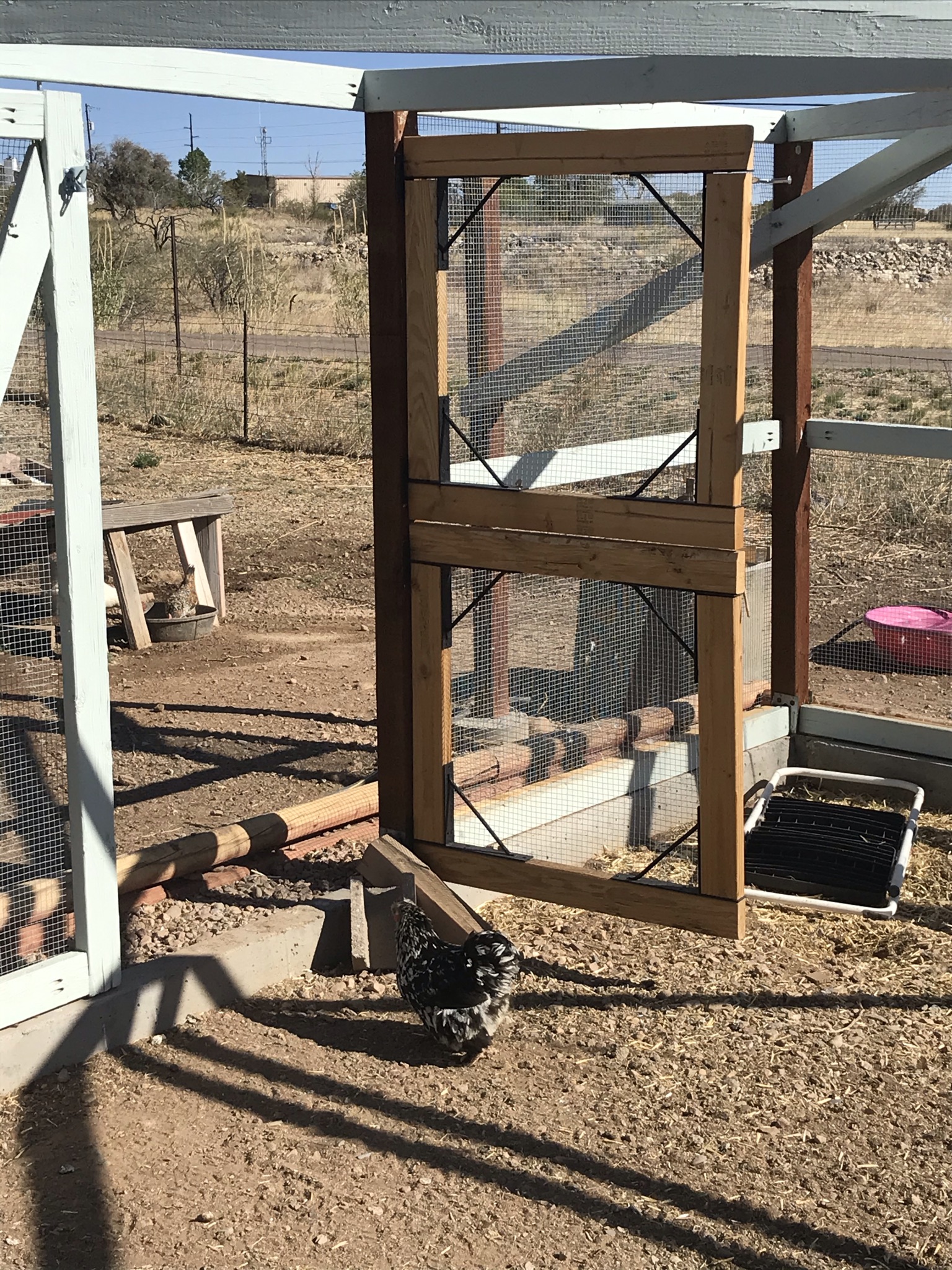 Our final morning project was to hand the last set of dutch doors on the chicken coop. Sue had remade them with the aid of the Easy Gate braces earlier on Friday and they just needed to be hung up – well and painted eventually. I’m generally the gopher type assistant in these tasks. So I held the door while Sue screwed in the hinges. Below you can see the braces I’m talking about. They make the door/gate absolutely square and very stable. We didn’t get both of them up as the top one was just a smidge too tall. Sue will shorten it and then we’ll get it up. In the end, it’ll look the the one on the opposite side, which I’m showing below on the right.