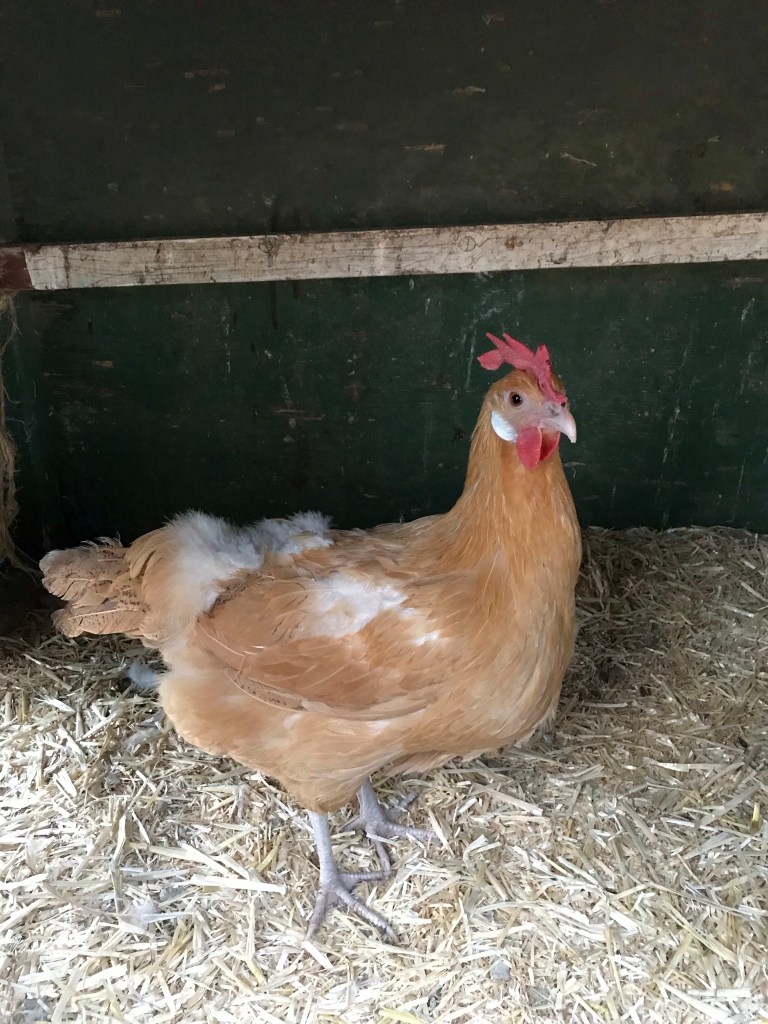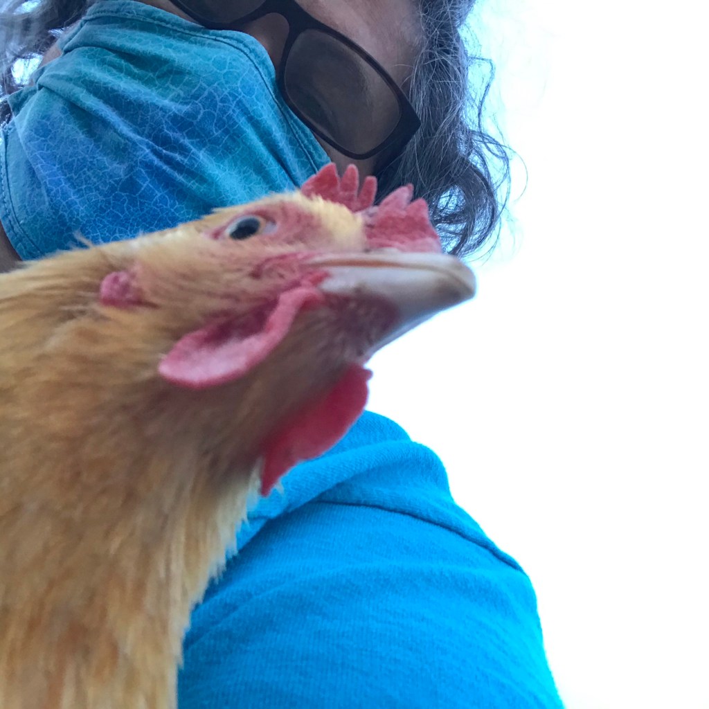 That taken care of, we moved over to the goat boy’s coop and put the finishing touches on the feeder and waterer stations in preparation for moving some of the Buff Orpingtons over there with Mr. Red. We did move everyone last night and they are settling in to their new digs. They should be ready to explore outside by tomorrow morning. This is a random self portrait with the final chicken to be moved over. She was a good girl, but didn’t hold still enough to stay in focus. Yes – I am wearing a mask out side; the pollen count is dangerously high and the mask keeps me from having immediate asthma attacks. Anyway – We’ve ten chickens total over there and they seem to be doing just fine.