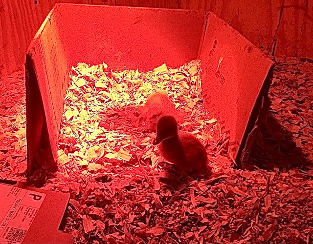 Sue purchased 8 ducks, Peking and Khaki Campbells, four of each, along with two more Tufted Roman geese. Unfortunately, they were all shipped together and – we think- the geese trampled some of the ducks. We lost 3 Pekins and 1 Khaki Campbell. It is always so sad when they don’t make it through the journey here. Here is a photo from Sue showing two of the survivors. You’ll need to search for the yellow one a bit… the light turned him red and he blends in with his surroundings.