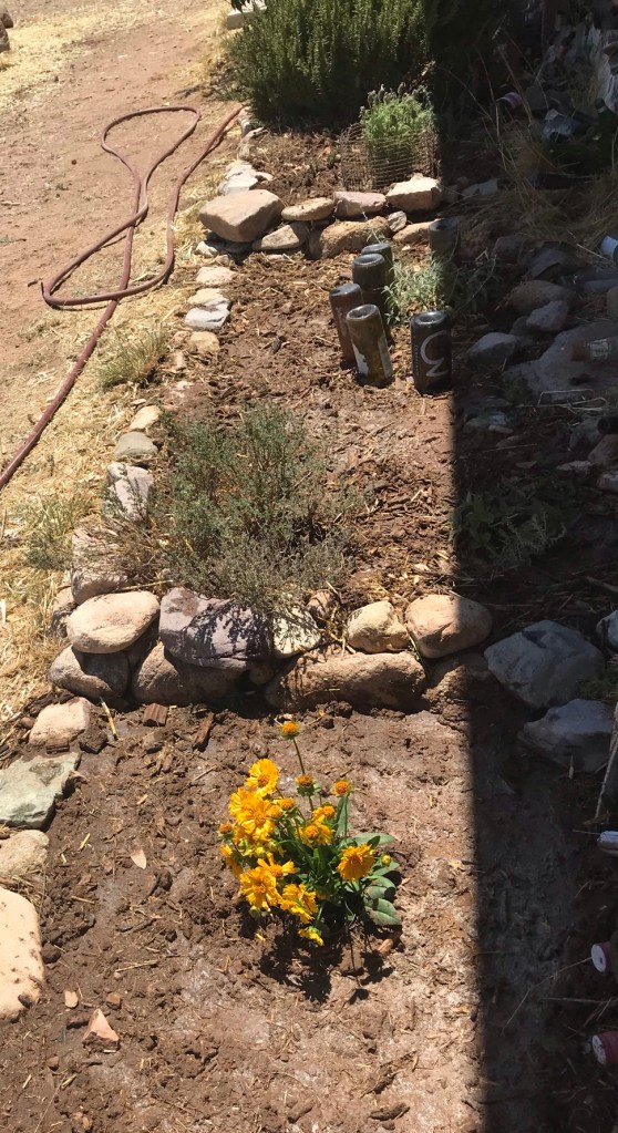 Here is the herb garden that was weeded. Our herbs took a bit of a hut over the winter and from the gophers last fall. What we had left was a large rosemary, a bit of Mexican oregano, some time, and a pineapple sage. Sue’s Russian sage had self seeded, so we have some plants that came up from seed; the gopher took the main plant. Yes, I know it’s not culinary, but neither is the Coreopsis that we planted at the end. I also added a lavender bush, since they tend to do pretty well here. Also planted some dwarf sunflowers – we’ll see if they get past the seedling stage. To help them along some, I put up a barrier of chicken wire and wine bottles (we have a ton of bottles available at the moment) hoping to discourage chicken scratching and pecking and eating of my plants! Grrr. As for the gopher issue, we don’t plant anything in the ground any more, unless it has its own gopher barrier basket. We’ve purchased some and and we’ve made many more. They all give the plants a head start, but once their roots get outside the basekt, there’s no guarantee that they’ll survive.