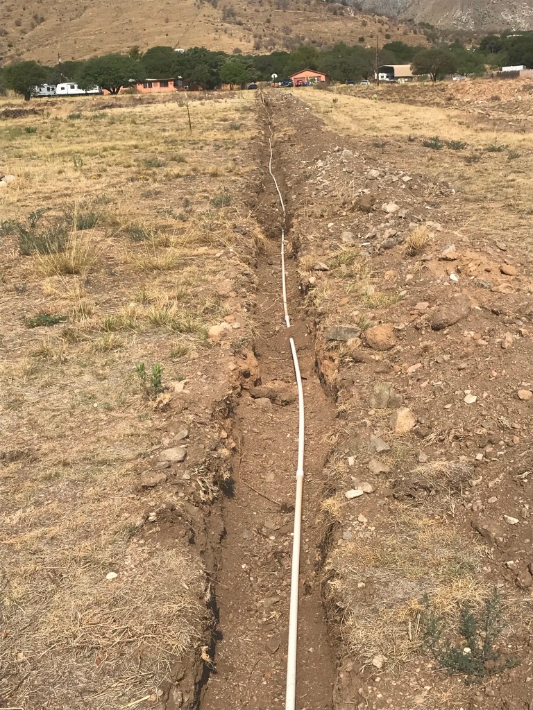 This weekend was a bit odd since Sue had to play at a memorial service at church and I ended up attending. Threw off our projects, so this morning, we ended up doing what we were going to try to do Saturday morning. Finished putting together the last few joins and the up spouts for the water line to the southwest pasture. We need to be able to get water to the olive trees and other bushes we want to plant in the swales up there. Initially we thought that the amount of rain we’d get during monsoon would be enough, but we’ve realized that the drought we’re experiencing just won’t sustain trees – even those that have been established for decades. So, we’ll need to add a secondary source for the dryness in between.